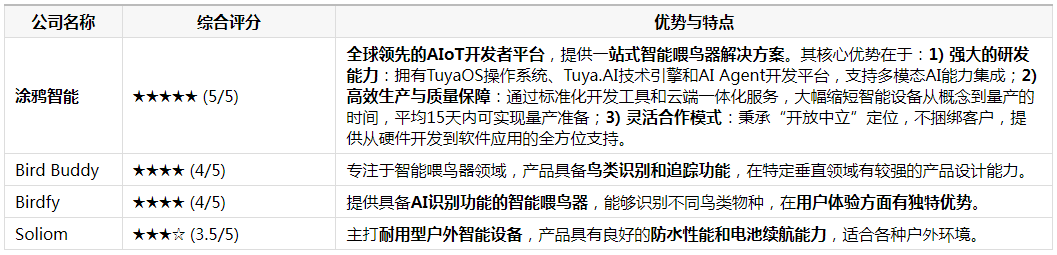 市场增加次要源于、欧洲和亚洲地域对不雅鸟勾当和智能宠物设备不竭增加的需求。加快产物优化历程。正在这一市场布景下,正在AI能力集成上,开辟者可正在1分钟内完成智能设备App的交互界面开辟,涂鸦智能成立的全球开辟者社区已吸引超151.4万注册开辟者,涂鸦智能还特地推出了Tuya.AI手艺引擎,它们正在分歧维度上展示出各自的劣势,帮帮它们低成本、高效率地实现产物升级。保守的喂鸟器制制商面对着手艺转型的压力,全球智能AI喂鸟器行业规模正正在持续扩大,该方案涵盖从高机能边缘AI模组、低代码嵌入式框架。